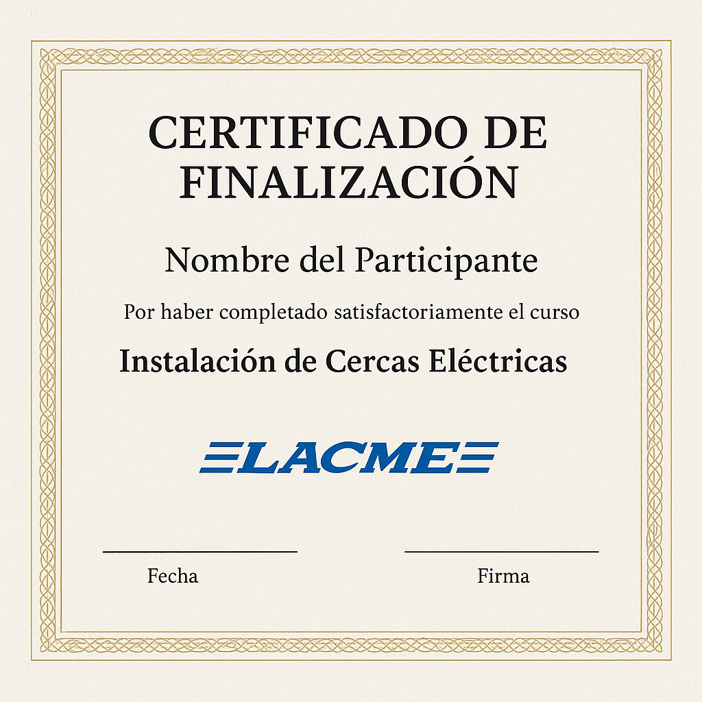 Al completar el curso recibirás un certificado digital auténtico LACME, que valida tus conocimientos en instalación de cercas eléctricas y te diferencia como técnico profesional.